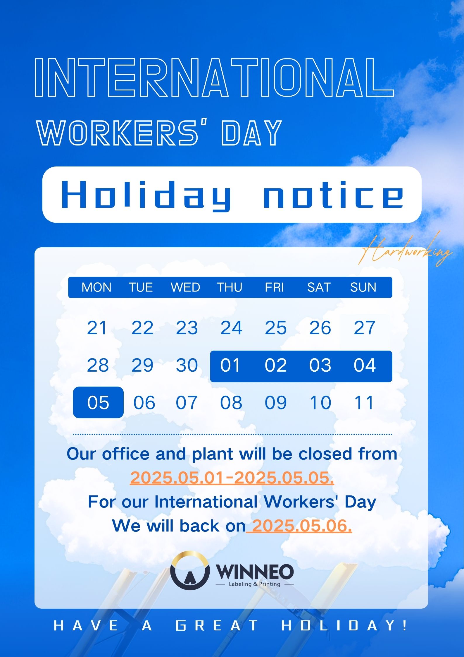 Hello! According to the national statutory holidays, our company will be closed for 5 days from May 1 (Thursday) to May 5 (Monday) 2025 (China time). Normal work will resume on May 6 (Tuesday).