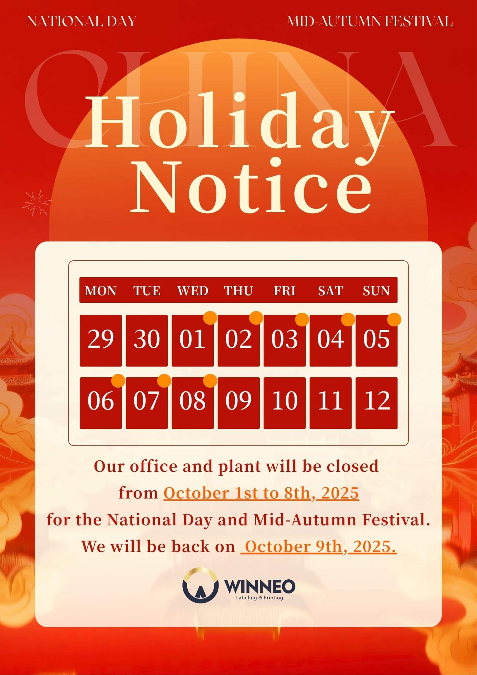Please be informed that our office will be closed for the Mid-Autumn Festival and National Day holiday from October 1st to 8th, 2025, and resume work on October 9th, 2025.