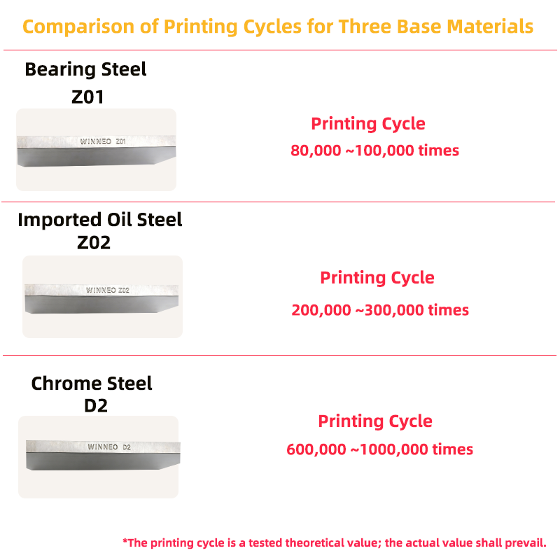 WINNEO ADVICE: The common steel (such as the GCr15 or 2510# steel material) cliché plates can be reground and reuse 2 or 3 times, and the Chrome steel cliché plates (such as the D2), you can reuse 5 times or more.